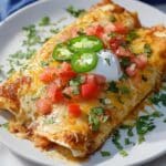 Pour the creamy cheese sauce generously over the top of the arranged burritos. For added zing, drizzle some extra green enchilada sauce if you like. Bake uncovered for 15-20 minutes until the edges of the tortillas turn golden brown and toasty, and the cheese sauce bubbles invitingly.