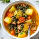 A hearty and flavorful Spicy Sausage and Potato Soup featuring smoky chorizo or andouille sausage, tender potatoes, vibrant kale, and aromatic vegetables simmered in a savory chicken broth. Perfect for a comforting and quick meal ready in just 35 minutes.
