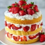 Keywords: Strawberry Shortcake Cake, layered cake, whipped cream frosting, fresh strawberries, dessert, summer cake, celebration cake