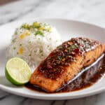 This salmon pairs wonderfully with fluffy white rice or nutty quinoa for a wholesome, hearty meal. Steamed or roasted vegetables like broccoli, asparagus, or snap peas create a fresh, colorful contrast to the rich glaze. For an added touch, try a light cucumber salad with a citrus vinaigrette to brighten up the plate.