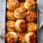 Rectangular metal baking tray filled with a full dozen of freshly baked golden-brown cheddar biscuits, each one fluffy and perfectly risen with crisp, textured tops, arranged closely together to showcase their layers and tender crumb, set atop a white marble countertop under natural lighting, styled as a professional food magazine hero shot, photo taken with an iphone --ar 4:5 --v 7