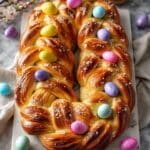 This Traditional Italian Easter Bread is a sweet, braided bread enriched with citrus zest and eggs, decorated with vibrant dyed Easter eggs baked right into the dough. Perfect for celebrating the holiday, it offers a soft, slightly sweet texture with a beautiful golden crust.