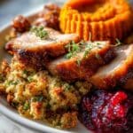 Once everything is cooked to perfection, carve your turkey, plate generous helpings of the stuffing and spiced pumpkin cream, and serve alongside that bright cranberry sauce and tender vegetables. The combination makes for a festive dining experience that delights every palate.