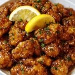 Large white serving bowl filled with a generous portion of glazed golden-fried chicken pieces coated in a shiny, sticky honey-garlic sauce, garnished with finely chopped fresh herbs and two bright lemon wedges placed on top, the whole dish captured in a professional 3/4 angle shot on a white marble countertop with natural lighting, styled like a hero shot from a food magazine, photo taken with an iphone --ar 4:5 --v 7