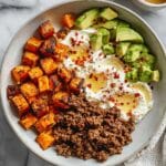 This Viral High-Protein Cottage Cheese Taco Bowl combines hearty roasted sweet potatoes, flavorful spiced ground beef, creamy cottage cheese, and fresh avocado for a satisfying and nutritious meal. Perfect for a quick weeknight dinner or meal prep, it’s packed with protein and vibrant flavors with a spicy-sweet kick from hot honey.