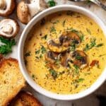 A comforting and hearty Wild Rice and Mushroom Soup made with a blend of wild rice, cremini mushrooms, and fresh vegetables simmered in savory vegetable broth, finished with creamy Parmesan cheese. This warming soup is perfect for cozy dinners and offers a rich, earthy flavor with a creamy texture.