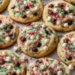 These Winter Wonderland Chocolate Chip Christmas Cookies are festive, chewy, and bursting with white and dark chocolate chips along with colorful red and green holiday sprinkles. Perfect for creating a cozy holiday atmosphere, cookie swaps, or festive gatherings, these delicious cookies combine rich flavors and fun textures in every bite.